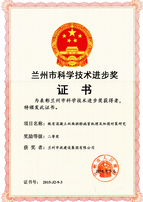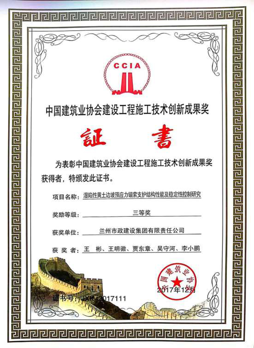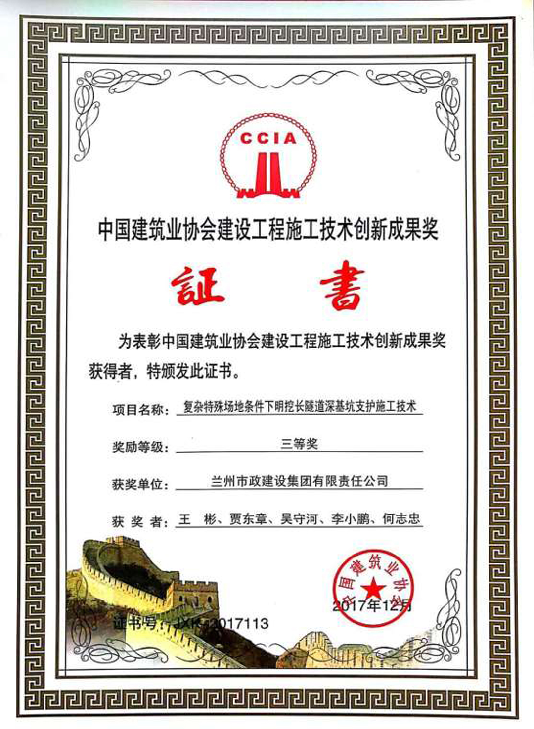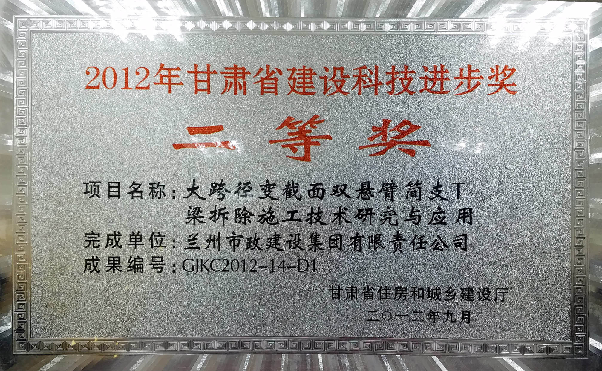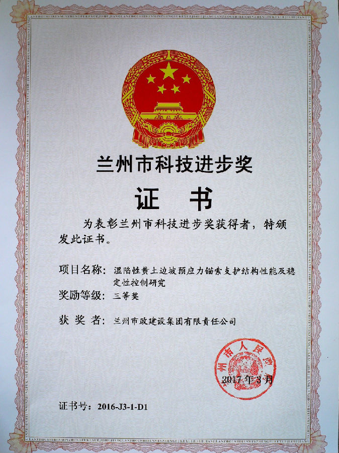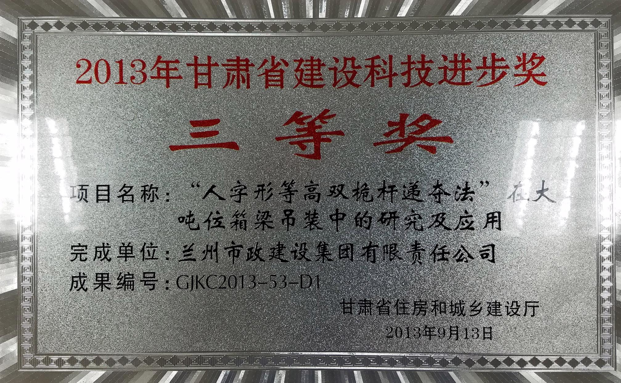 科技進步獎公司堅持實施“科技興司”戰略,產、學、研結合,大力開展“四新”技術及建筑業“十項”新技術的應用、研發和推廣,取得了一大批自主研發成果,公司獲得國家專利8項、國家級工法2項、省級工法20項、省建設科技進步獎15項、省建設科技示范工程4項,通過省建設科技成果鑒定21項,大部分科技成果處于國內領先水平,公司曾獲得“全國建筑業科技進步與技術創新先進企業”、“肅省技術優勢企業”等稱號,公司技術實力處于西北同行業前列。