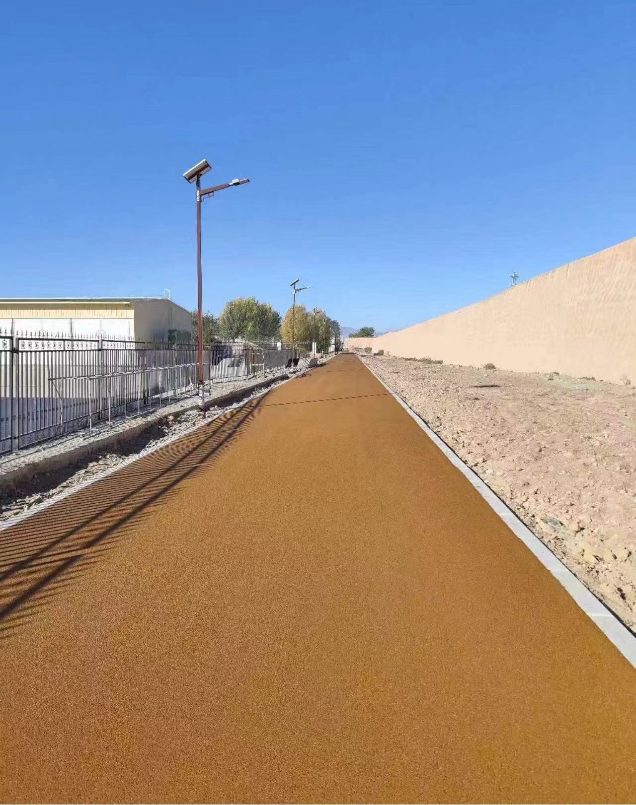 由道面工程公司參建的武威滿城環境整治工程彩色瀝青面層鋪筑工程位于武威市涼州區,整條道路繞城墻內側一周,線路全長4030m。在鋪筑過程中,項目部克服氣溫下降、工期緊張、材料運距較遠等困難,精心組織,合理安排,積極與當地的瀝青混凝土拌合站溝通協調,解決了及時出料、運料的問題。派專人入駐拌合站,協同生產,對瀝青混合料的配合比實時把關,保證出料質量。現場施工人員每天早晨七點到位,各司其職,項目管理人員全程把控每一道工序對應的每一個技術標準,確保施工安全、工程質量受控。目前,彩色瀝青面層鋪筑工作已經完成,已成為滿城一道靚麗的風景線。