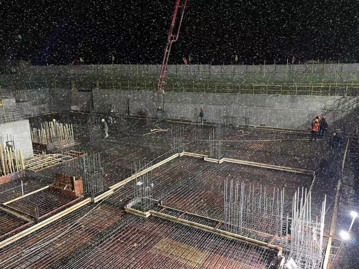 由第一工程公司承建的涼州區社會養老院建設項目已進入沖刺四季度的關鍵期。進入10月以來,受強冷空氣影響,涼州區迎來了持續的強降雪天氣。該項目部結合當地天氣狀況,提前優化施工方案,加強現場巡回檢查頻次,仔細排查安全隱患,在做好人員防寒保暖的同時,加快項目施工進度;現場施工人員頂風雪、戰低溫,鼓足干勁,攻堅克難,掀起冬季施工大干高潮。截至目前,1#安養樓已完成筏板基礎澆筑,卷材防水鋪設和保護層的施工,以及隔震層鋼板的安裝,隔震層梁、板、柱、墻混凝土澆筑,并完成支座安裝;2#安養樓完成防水鋪設和保護層施工,完成筏板基礎鋼筋綁扎50%工作量。