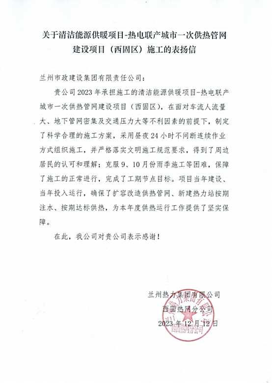 近日,公司收到業主單位蘭州熱力集團有限公司西固熱網分公司的一封表揚信。對我司承建的熱電聯產城市一次供熱管網建設項目(西固區),克服車流人流量大、地下管網密集、雨季施工等困難,制定科學合理的施工方案,采用晝夜24小時不間斷連續作業方式,完成了工期節點目標,確保了按期達標供熱給予充分肯定并表示感謝!
