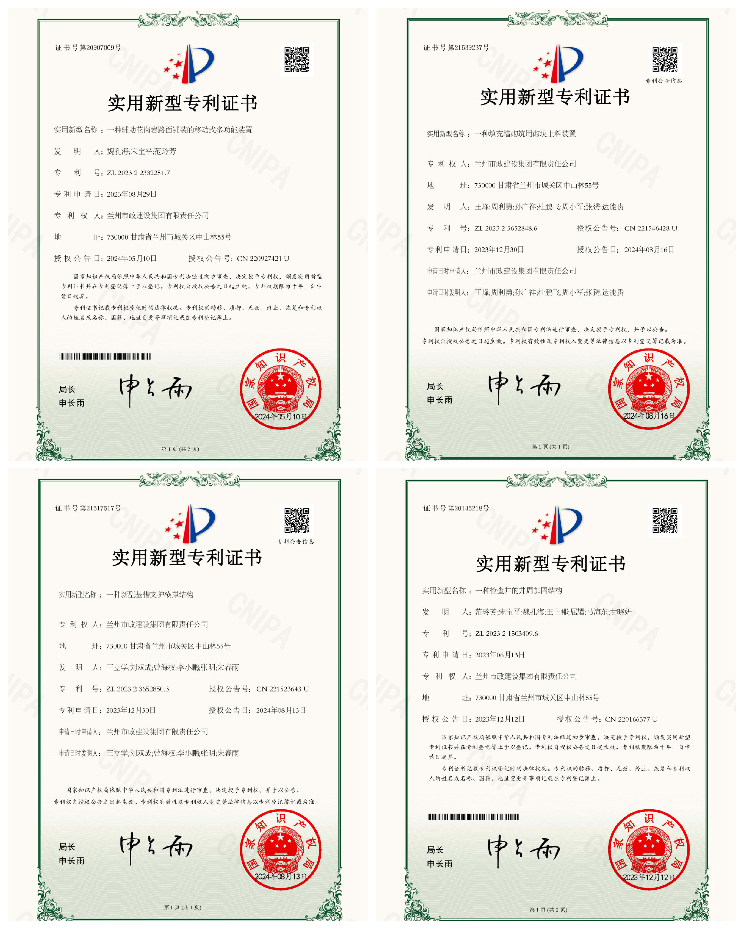 蘭州市政集團緊密結合在建工程施工特點,針對工程施工中的難點及瓶頸問題,持續加大科技研發投入,積極開展技術研發活動。2024年,公司新增“一種輔助花崗巖路面鋪裝的移動式多功能裝置”“一種填充墻砌筑用砌塊上料裝置”等實用新型專利授權11項,完成“一種水下灌注樁成孔垂直度檢測裝置”“一種裝配式鋼筋籠定位裝置”等實用新型專利受理10項,完成“一種濕陷性黃土區域邊坡防護結構及方法”“路緣石安裝定位裝置及其施工方法”發明專利受理2項。