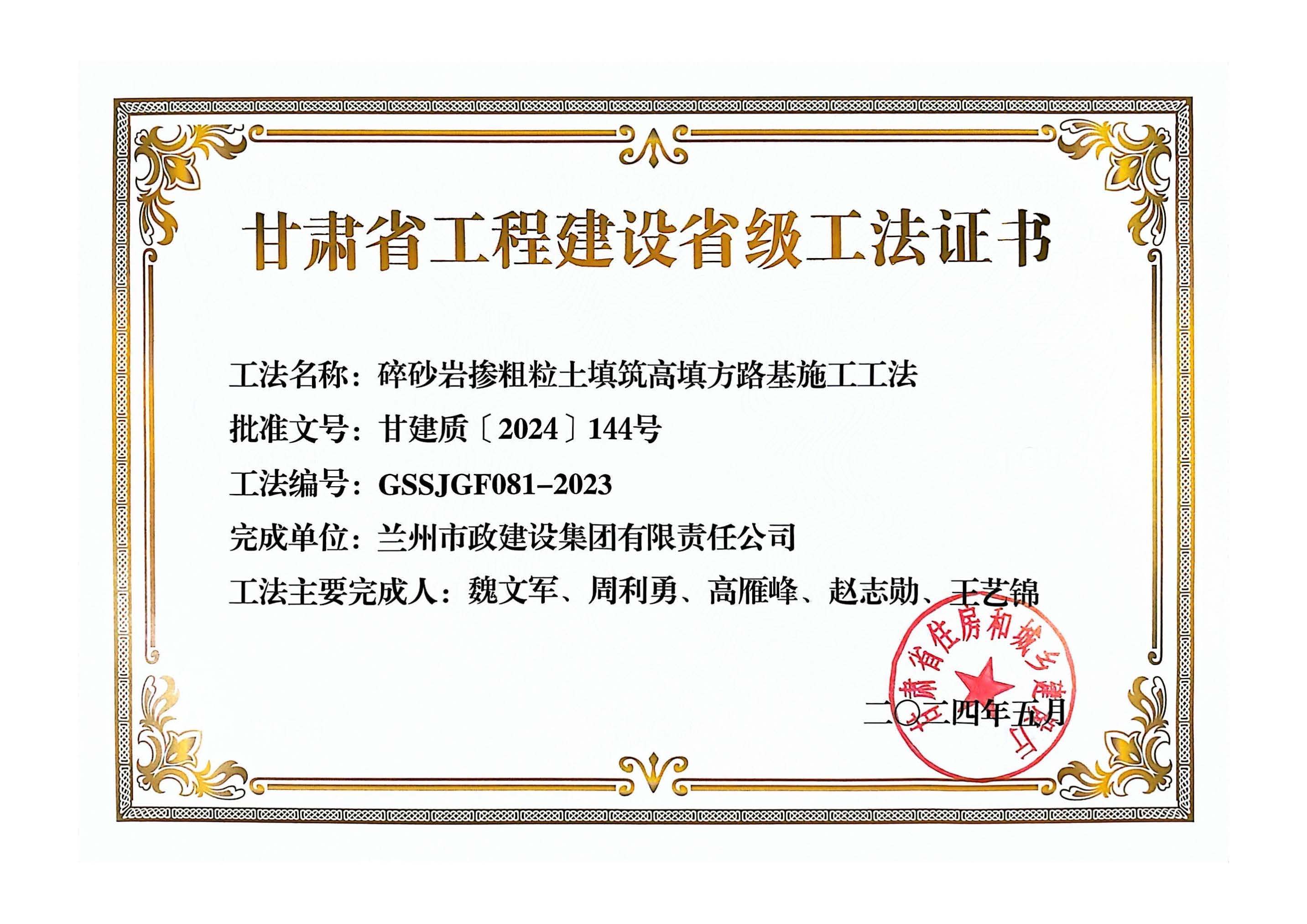 在蘭州經濟技術開發區皋蘭生態修復與產業發展示范區(起步區)S1502#路新建工程施工中,道路經過帶狀區域,地形起伏變化較大,大部分段落為深挖、高填區域,最大填方寬度為180m,高度為46m,針對該工程地質條件、地理環境、工程質量要求高、填料特殊等特點,公司結合實際情況,成立了高填方路基課題技術研發小組,通過反復試驗總結,為消除路基的不均勻沉降,形成了“碎砂巖摻粗粒土在高填方路基中的施工工法”,該工法獲甘肅省工程建設省級工法。