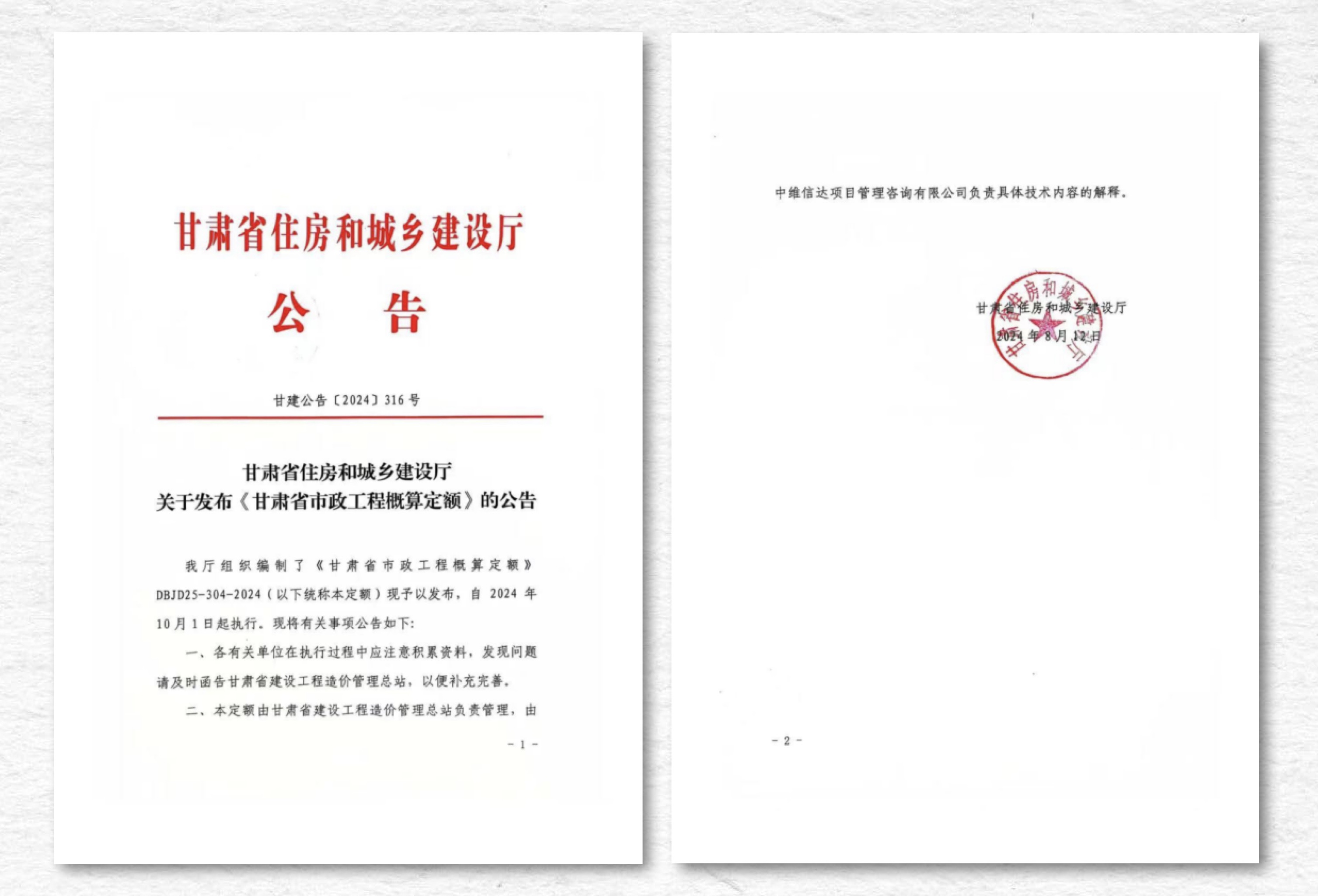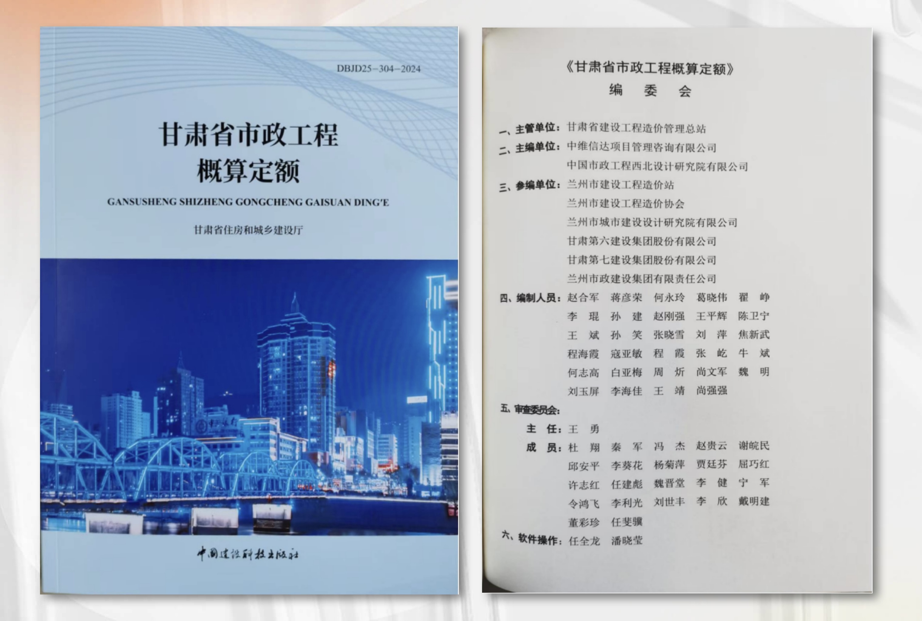 近期,由甘肅省住房和城鄉建設廳組織、公司參編的《甘肅省市政工程概算定額》順利通過驗收,由甘肅省住房和城鄉建設廳公告發布,自2024年10月1日起執行。該定額的發布填補了我省市政概算定額的空白。