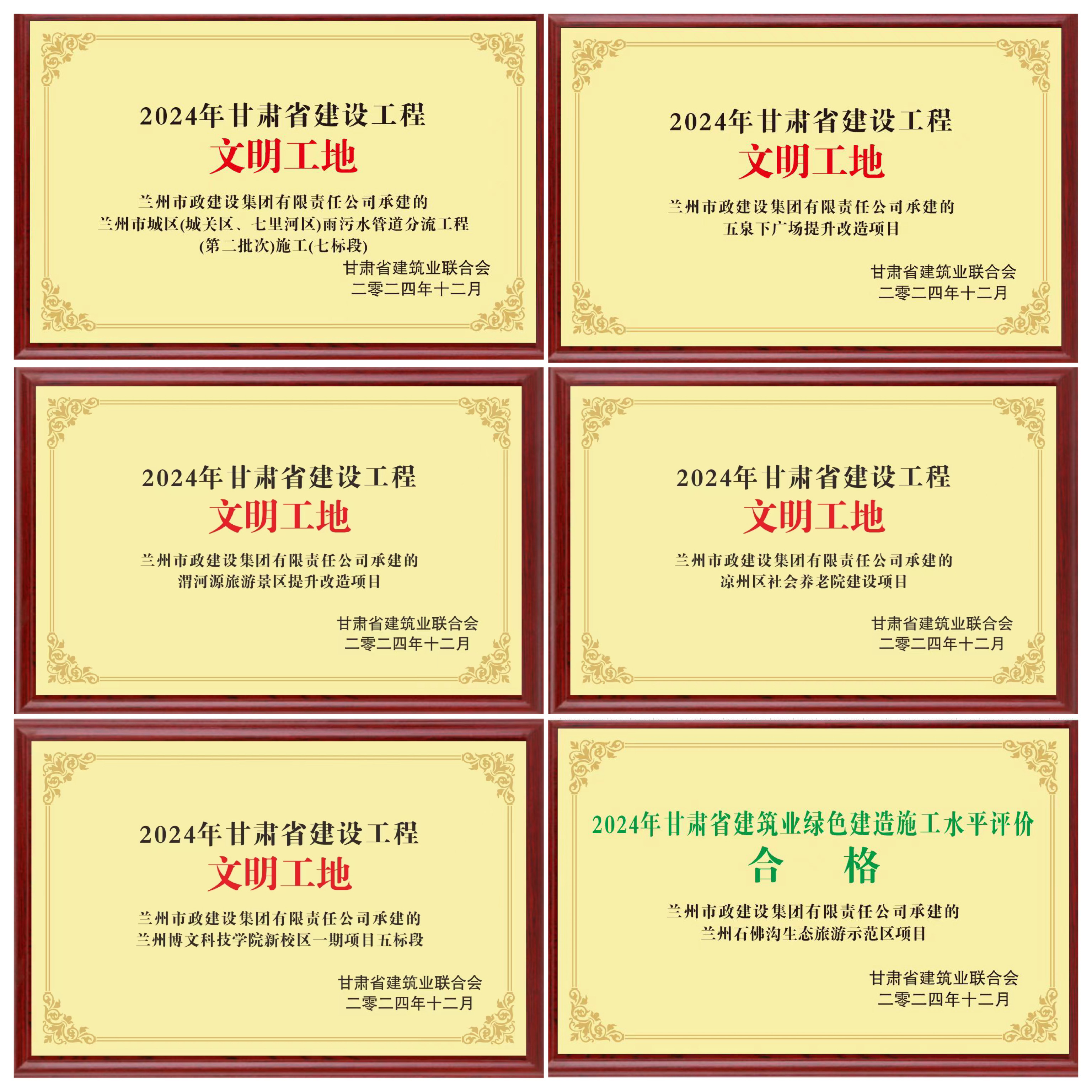 公司承建的涼州區社會養老院建設項目、蘭州博文科技學院新校區一期項目五標段、蘭州市城區(城關區、七里河區)雨污水管道分流工程(第二批次)施工(七標段)、五泉下廣場提升改造項目、渭河源旅游景區提升改造項目獲評2024年“甘肅省建設工程文明工地”,蘭州石佛溝生態旅游示范區項目獲評“綠色建造施工水平評價合格項目”。